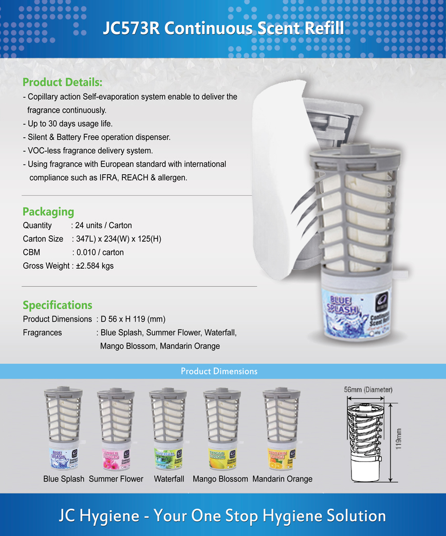 | Fragrance | Blue Splash, Summer Flower, Waterfall, Mango Blossom, Mandarin Orange |